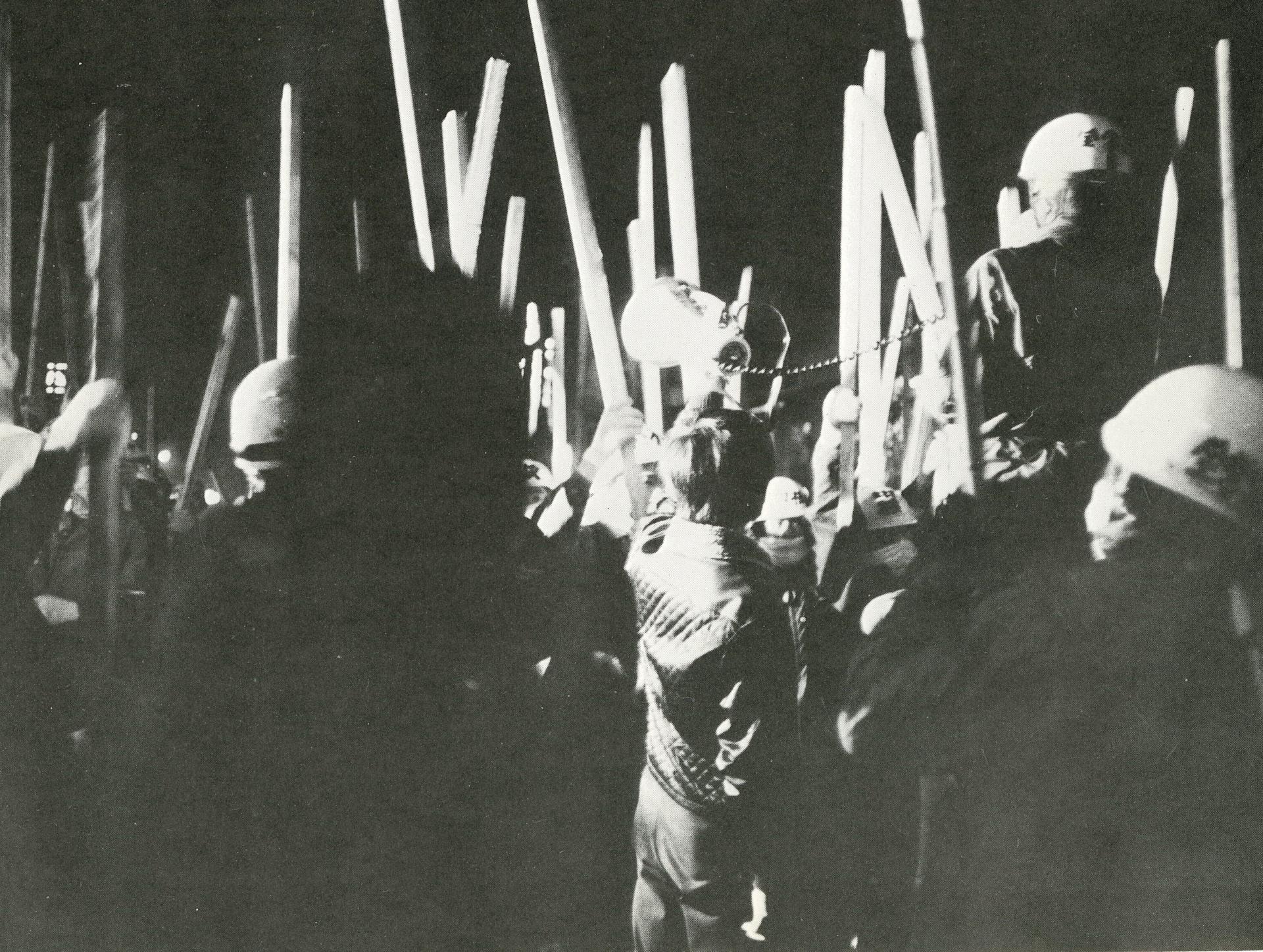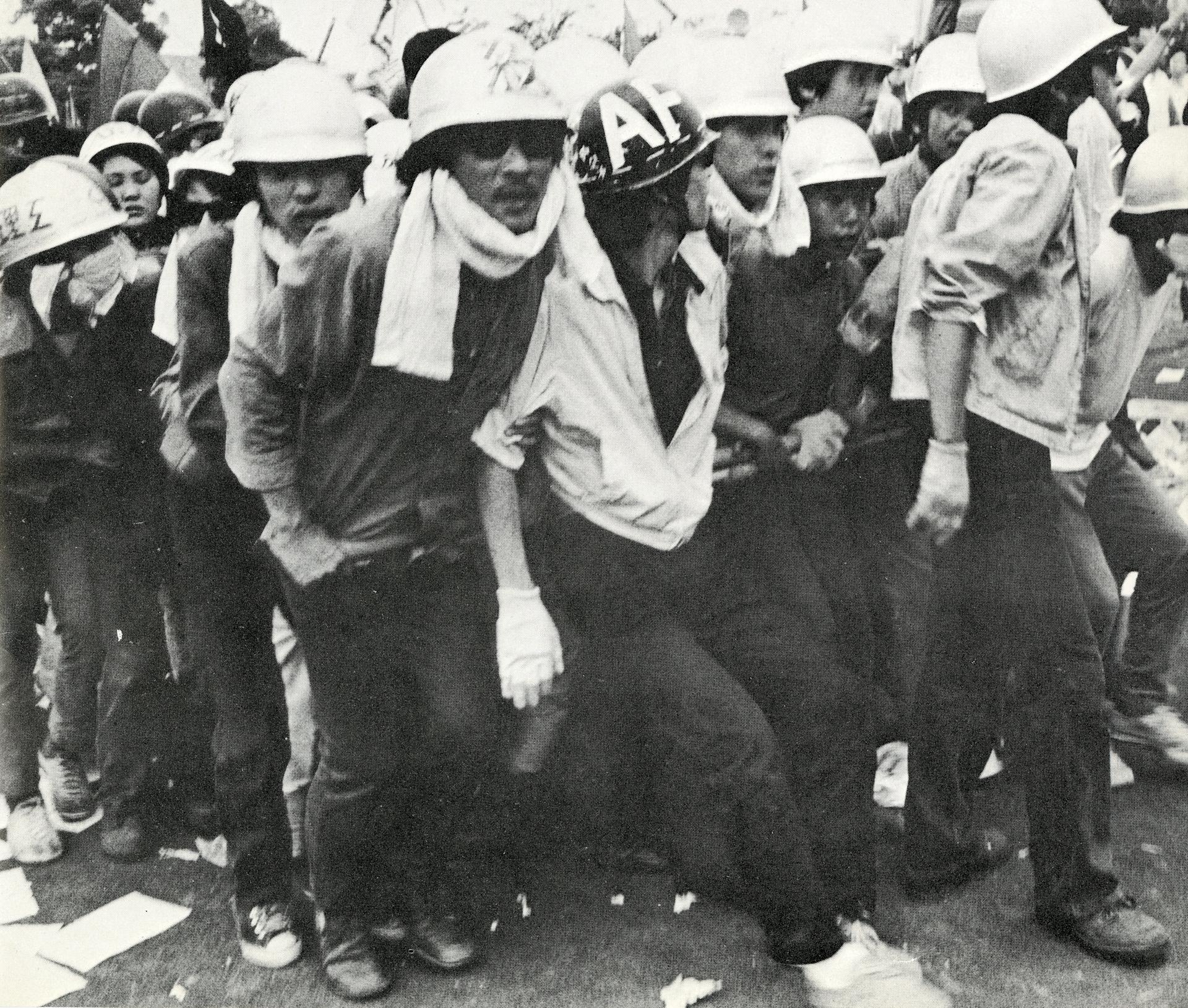 La lucha de Miike terminó en una serie de melés, en parte causadas por la división jerárquica entre trabajadores permanentes y trabajadores temporales. En un esfuerzo por superar esta derrota, un grupo de trabajadores de la mina de Taishō en torno al poeta y teórico Gan Tanigawa organizó un grupúsculo anárquico llamado la Tropa de Acción de Taishō dentro del sindicato oficial de mineros del carbón afiliado a Sōhyō.5 Empleando una organización basada en la afinidad y tácticas elusivas de disrupción, el grupo intensificó la disputa sobre los salarios más allá del punto de compromiso buscado por los sindicatos oficiales, y finalmente creó una comunidad autónoma de trabajadores desempleados en una montaña minera de carbón que estaba en proceso de abandono gradual. Para muchos revolucionarios que se habían sentido derrotados por la oleada anti-Ampo de 1960, esta lucha les proporcionó un nuevo e inspirador modelo de organización que continuaría a finales de la década de 1960.